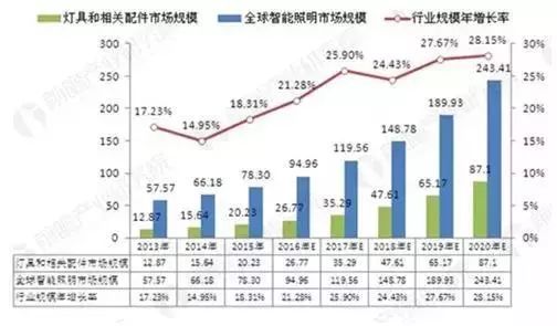 按照當(dāng)前發(fā)展勢頭,預(yù)計2020年可達(dá)243.41億美元,其中燈具和相關(guān)配件市場規(guī)模約為87.1億美元,占比超過5%,年復(fù)合增長率超過20%。