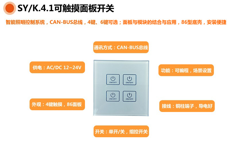 SY/K.4.1是廣州新威智能照明控制系統(tǒng)中的4鍵觸摸可編程86按鍵面板;采用鋼化玻璃觸摸材質(zhì),超長按鍵壽命,時尚美觀高檔,面板的4個按鍵通過CAN-BUS總線與電腦系統(tǒng)軟件編程實(shí)現(xiàn)不同的功能不同的場景設(shè)計,如全開、全關(guān)、觸發(fā)場景、組控制,交叉控制,多點(diǎn)控制各個模塊等,可自由組合多個面板實(shí)現(xiàn)多個場景設(shè)計。在充分適應(yīng)每個人不同生活習(xí)慣的同時,依靠DIY各種情景、聯(lián)動模式,打造獨(dú)特的生活、工作氛圍。