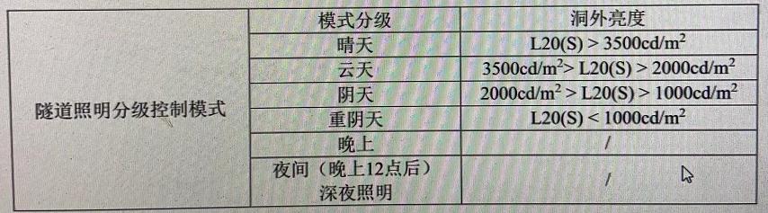 通過對每個(gè)季節(jié)內(nèi)一天24小時(shí)時(shí)間段洞外環(huán)境光亮度的變化規(guī)律,將隧道照明系統(tǒng)分為六級控制模式,分別為晴天、云天、陰天、重陰、夜間和下半夜,即可滿足隧道照明亮度的基本需求,各級的劃分依據(jù)如下: